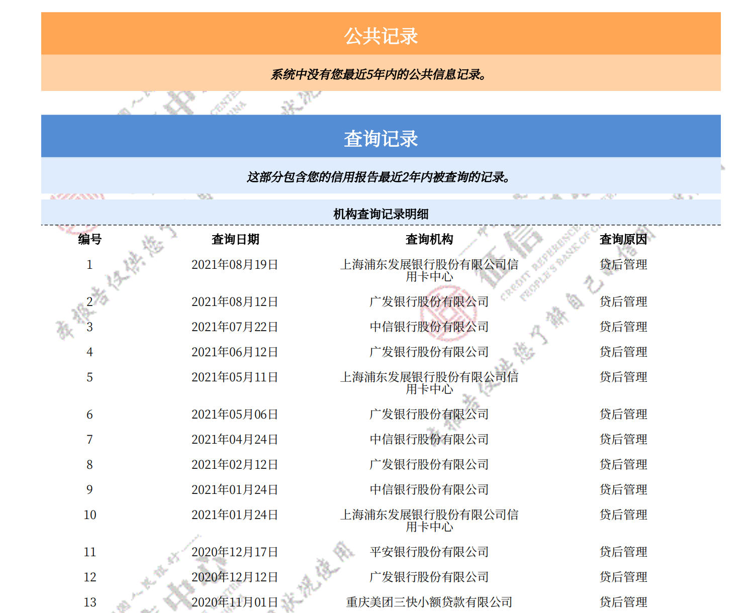 • 1. 个人信用报告:根据个人的信用信息,生成个人信用报告,包括个人基本信息、信用卡使用情况、贷款记录、逾期记录等内容。