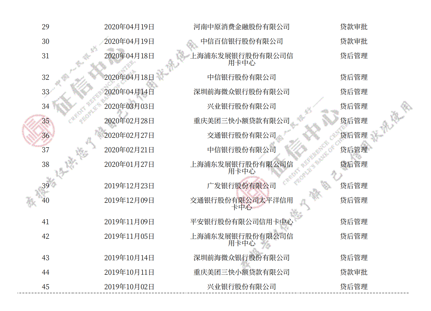 • 3. 征信查询:个人可以通过授权的方式查询自己的信用报告和信用评分,了解自己的信用状况。